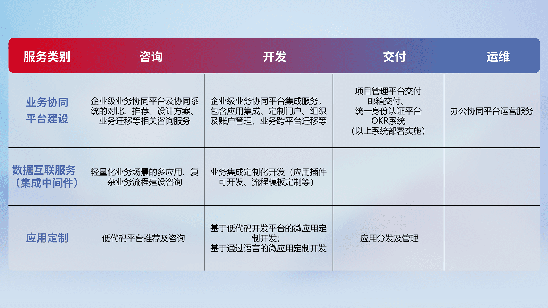 针对钉钉、、企微、、、IDaas等平台级产品提供产品的规划、、、方案、、交付、、、定制化开发等服务,,实现如统一协同办公、、、、智能客户服务、、、混合会议管理、、、智能数据查询、、等业务场景,,,实现数字化转型。。