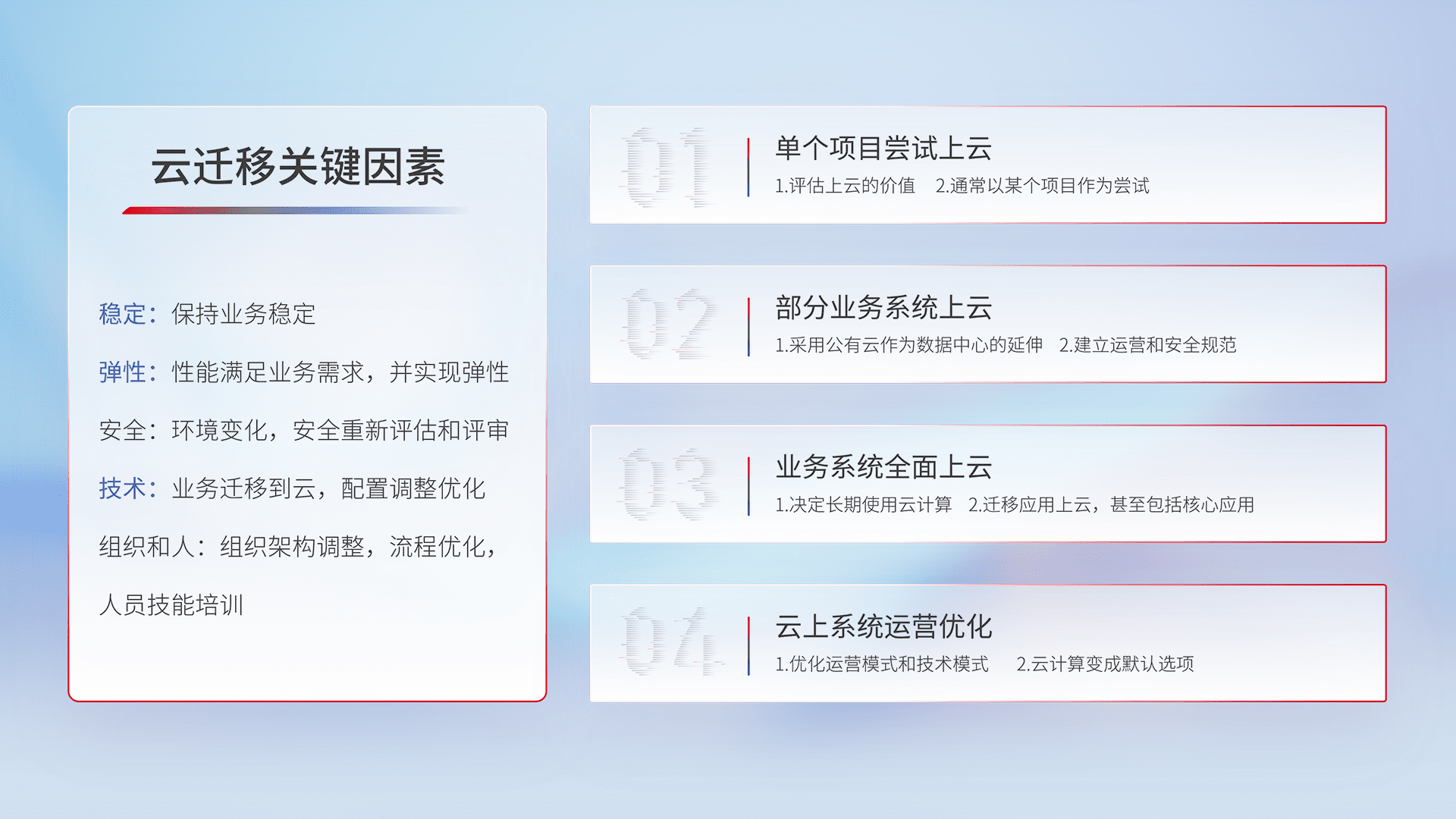 结合实际业务,,从规划设计、、、、云平台选型、、、、云原生改造、、数据迁移、、、、集成交付,,,,迁移全过程为客户识别最佳上云路径,,,做好风险识别管理,,设计网络架构、、、身份权限、、安全审计合规、、、、操作审计、、、、日志审计、、、监控告警策略、、多站点容灾设计等,,,对云上基础设施进行整体规划,,,提升IT治理水平,,,以满足弹性、、高可用、、、高性能的需求。。