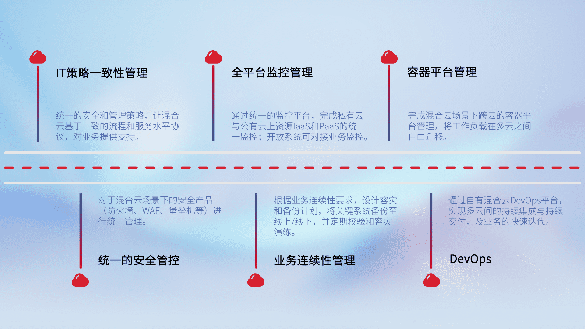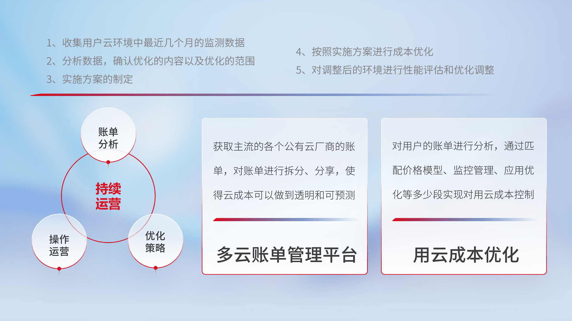 通过多云纳管,,,,以统一的资源数据模型把客户的云资源进行抽象和封装,,,进而实现对多云资源的统一操作,,,保障云资源管理的可靠性、、、、稳定性与可用性。。。。量身定制化运维内容,,配置、、、、开发运维、、补丁管理、、备份、、监控、、认证和访问管理、、审计和日常巡检等,,,,保障在用云过程中的可靠度,,,稳定度以及高可用率。。